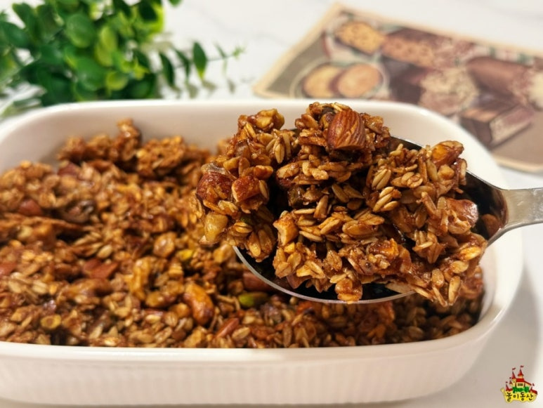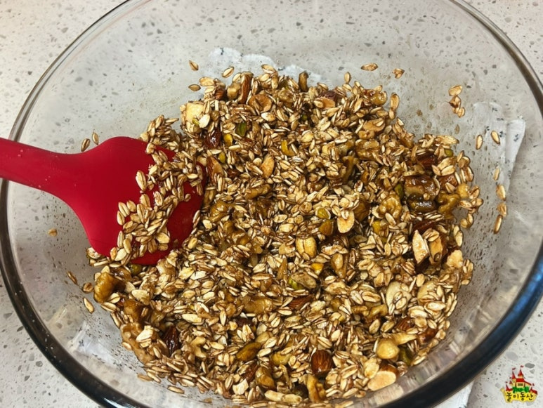 뜨거운 상태에서 그래놀라 눅눅하지만 완전히 식으면 바삭바삭해져요.