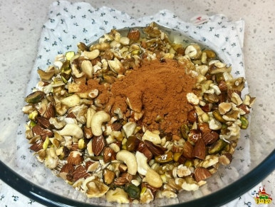 오트밀 200 g , 다진 견과류 160 g , 올리브유 60 g , 꿀 80 g , 시나몬가루 5 g , 소금 약간