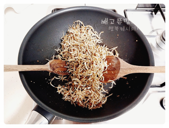 그리고 멸치를 팬 한 쪽으로 밀어 두고