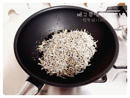 잔멸치 3 컵을 팬에 담아 줍니다.