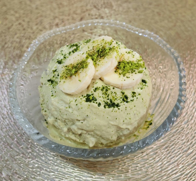 11. 틀 용도의 밥공기를~이쁜 그릇으로 옮겨 뒤집어엎어 예쁘게 담기. 토핑으로 생 바나나 몇 조각, 말차가루 약간 뿌려 완성하기.