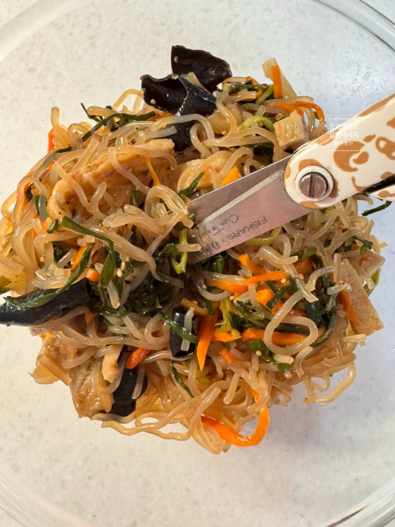 길게 엉켜있기 때문에 한두 큰술씩 넣고 만들기 쉽도록 가위로 듬성듬성 썰어주세요.