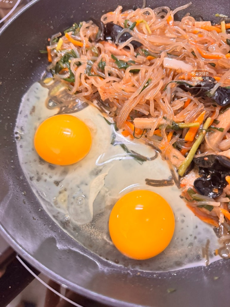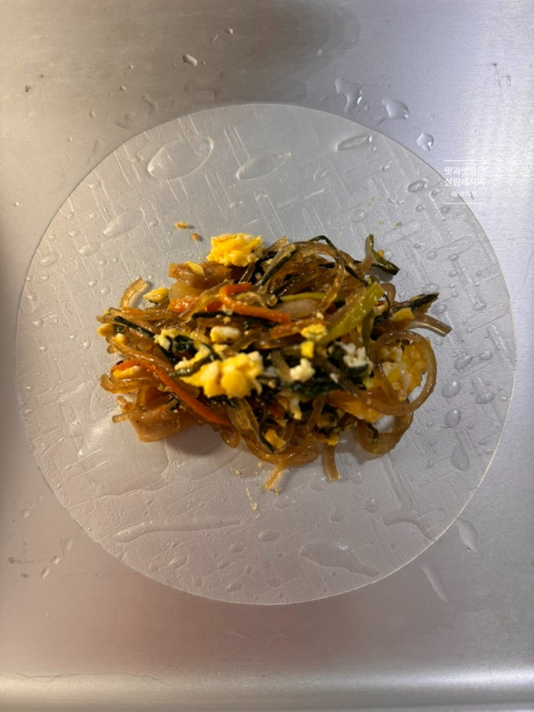 라이스페이퍼 10 장내외 , 남은 잡채 1 공기 (국공기 가득), 달걀 2 개 , 소금 후추 세네꼬집 , 식용유 적당량