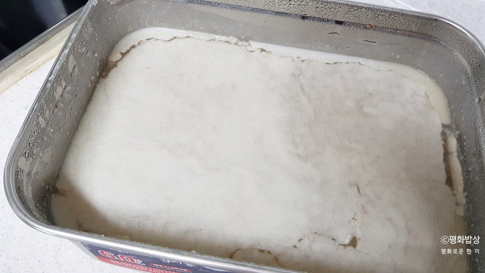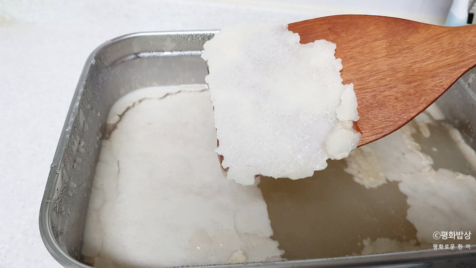 냉장실에서 돼지등뼈 삶은 물을 굳히면