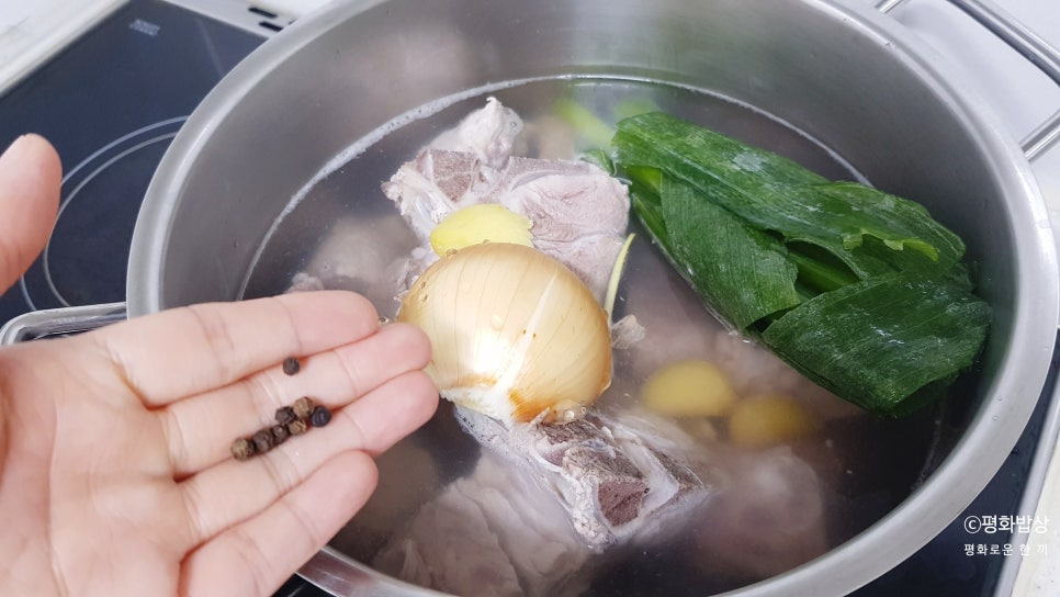 생강 한 톨, 대파 초록 부분, 통후추 몇 알을 넣고