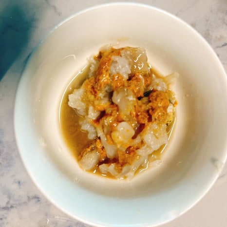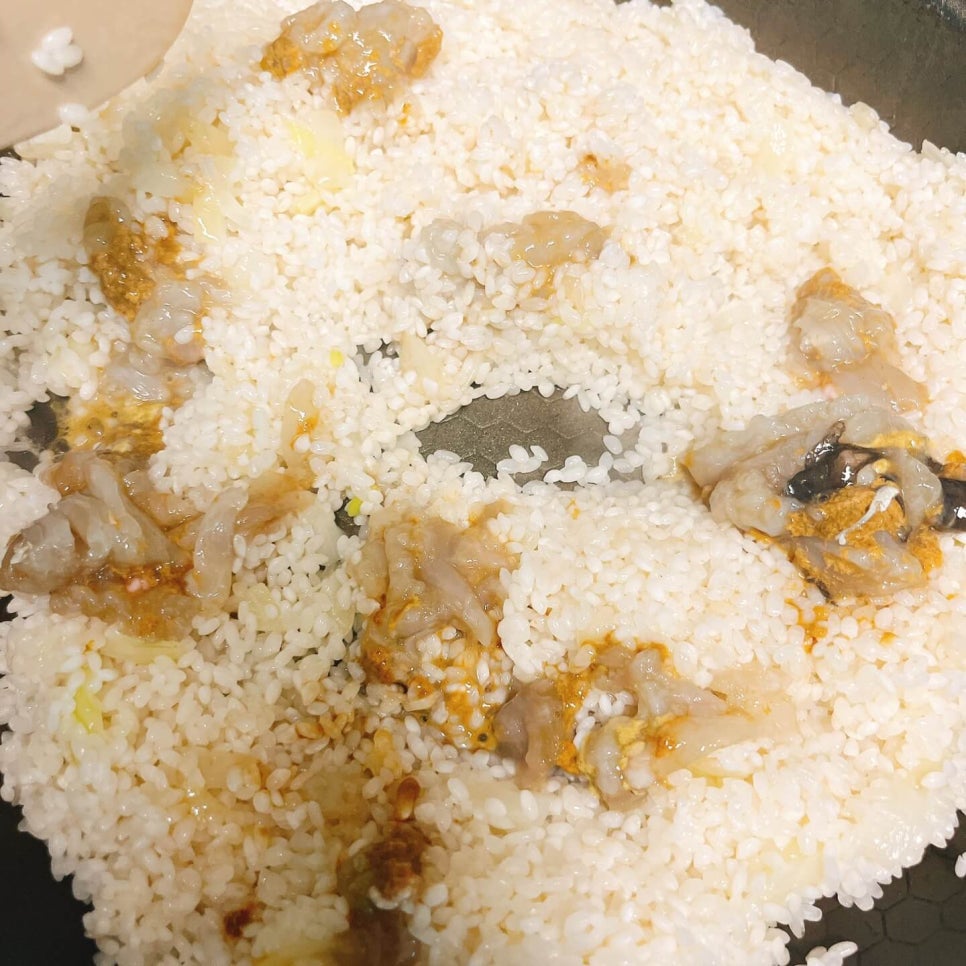게살 육수 한국자씩 넣어서 다증발할때까지 2 ~ 3번 볶아서
