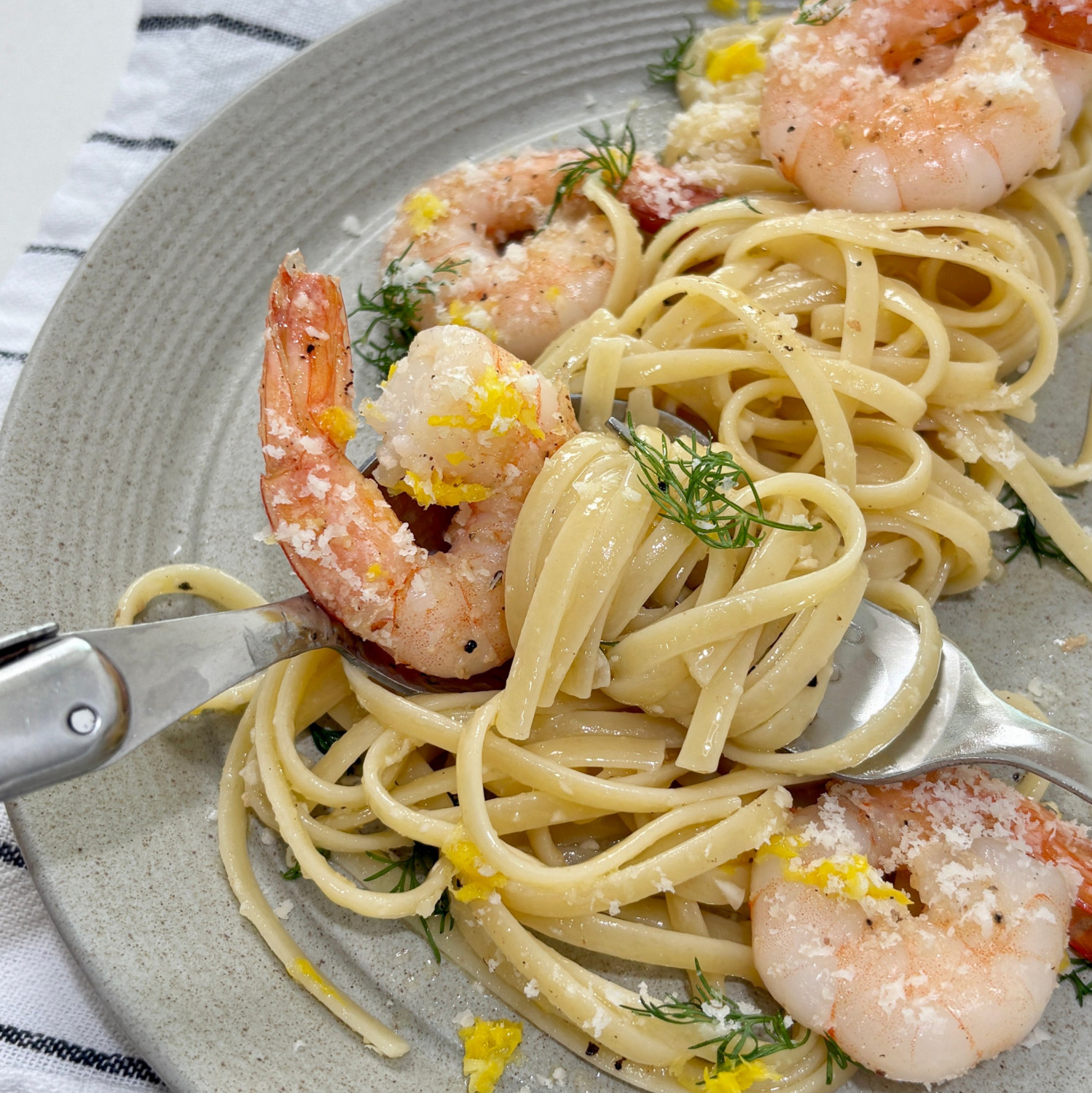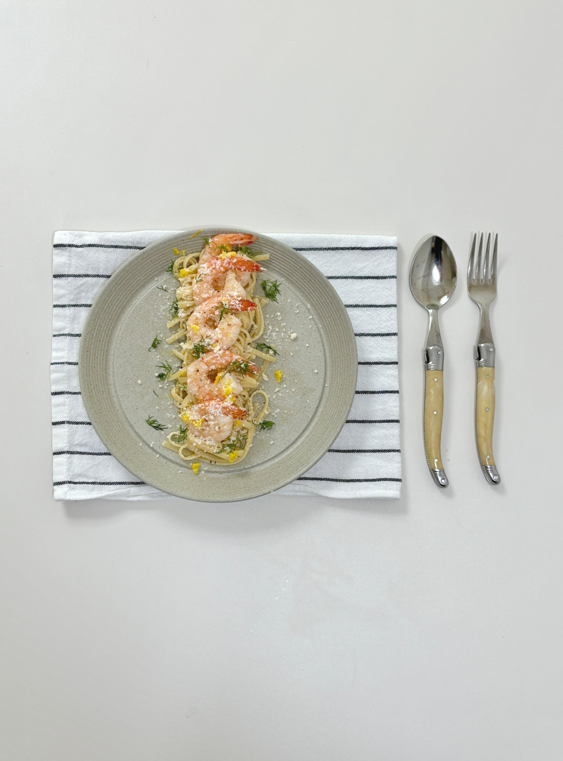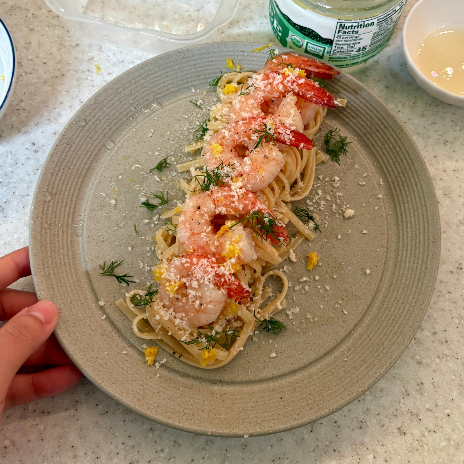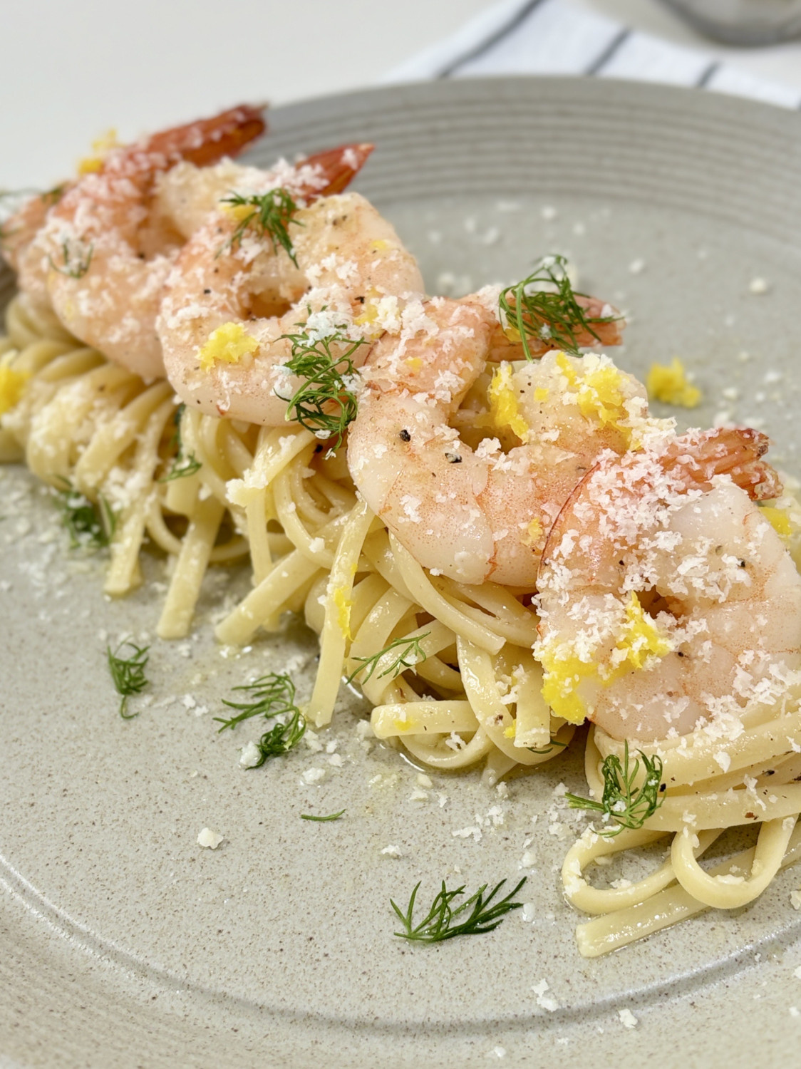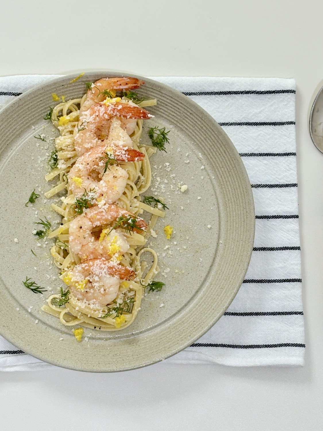 그 위에 새우와 레몬제스트, 딜, 치즈, 레몬즙 뿌리기