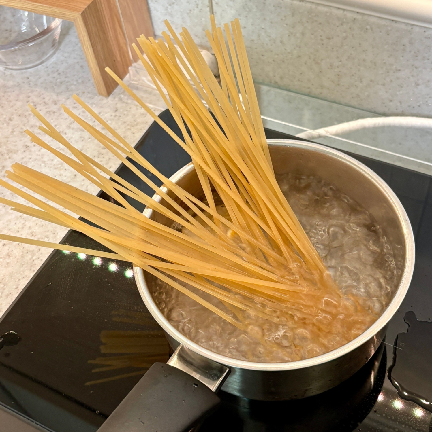 면수 1L에 소금과 레 몬껍질 넣고 링귀니 면 3~4분 삶기