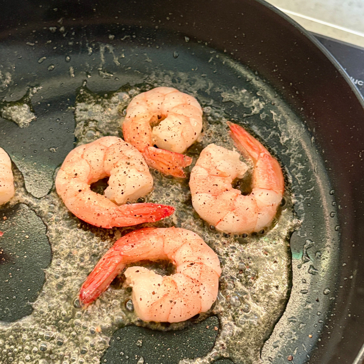 올리브오일을 두르고 새우 굽다가 버터와 소금, 후추 추가하기