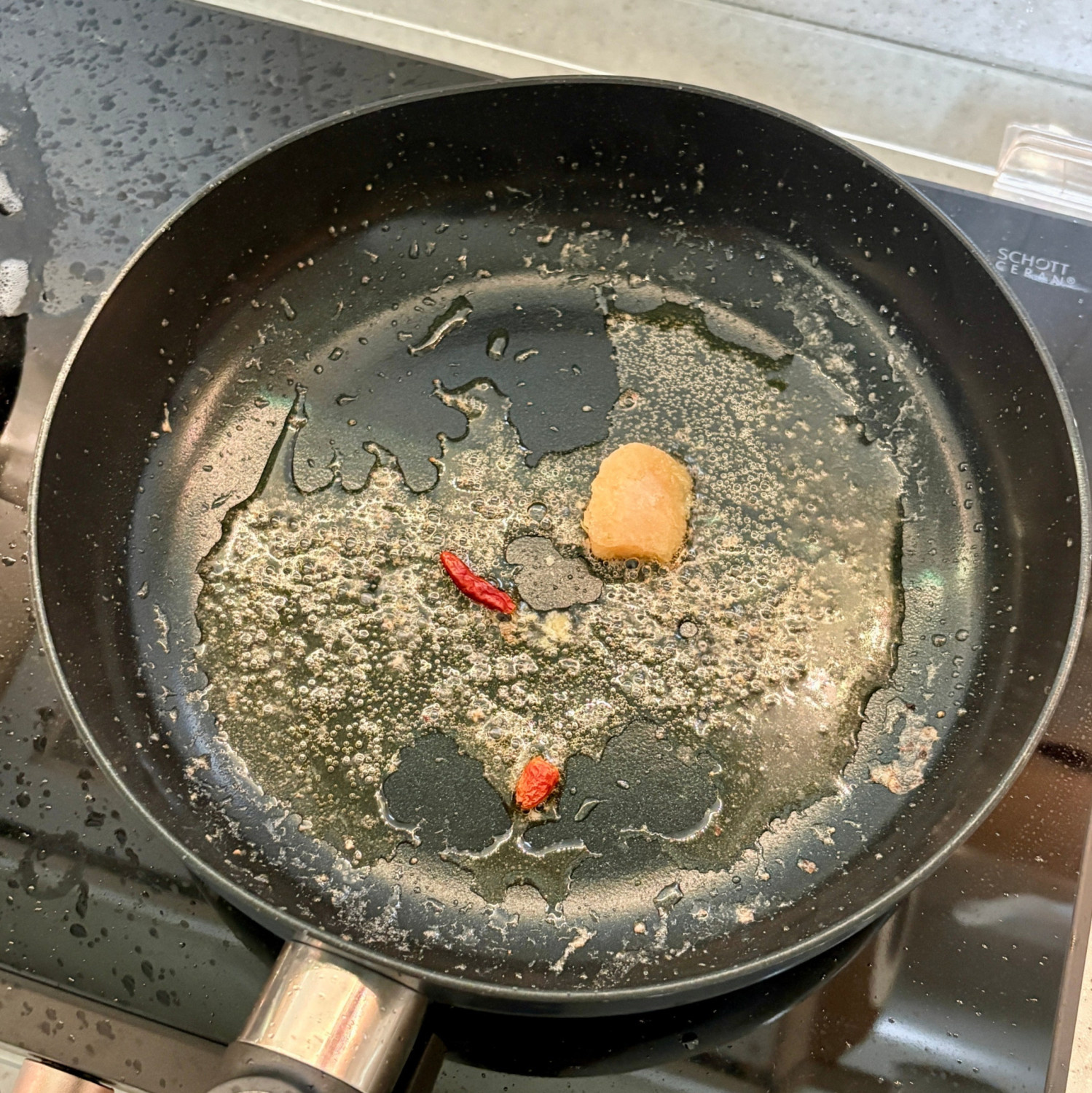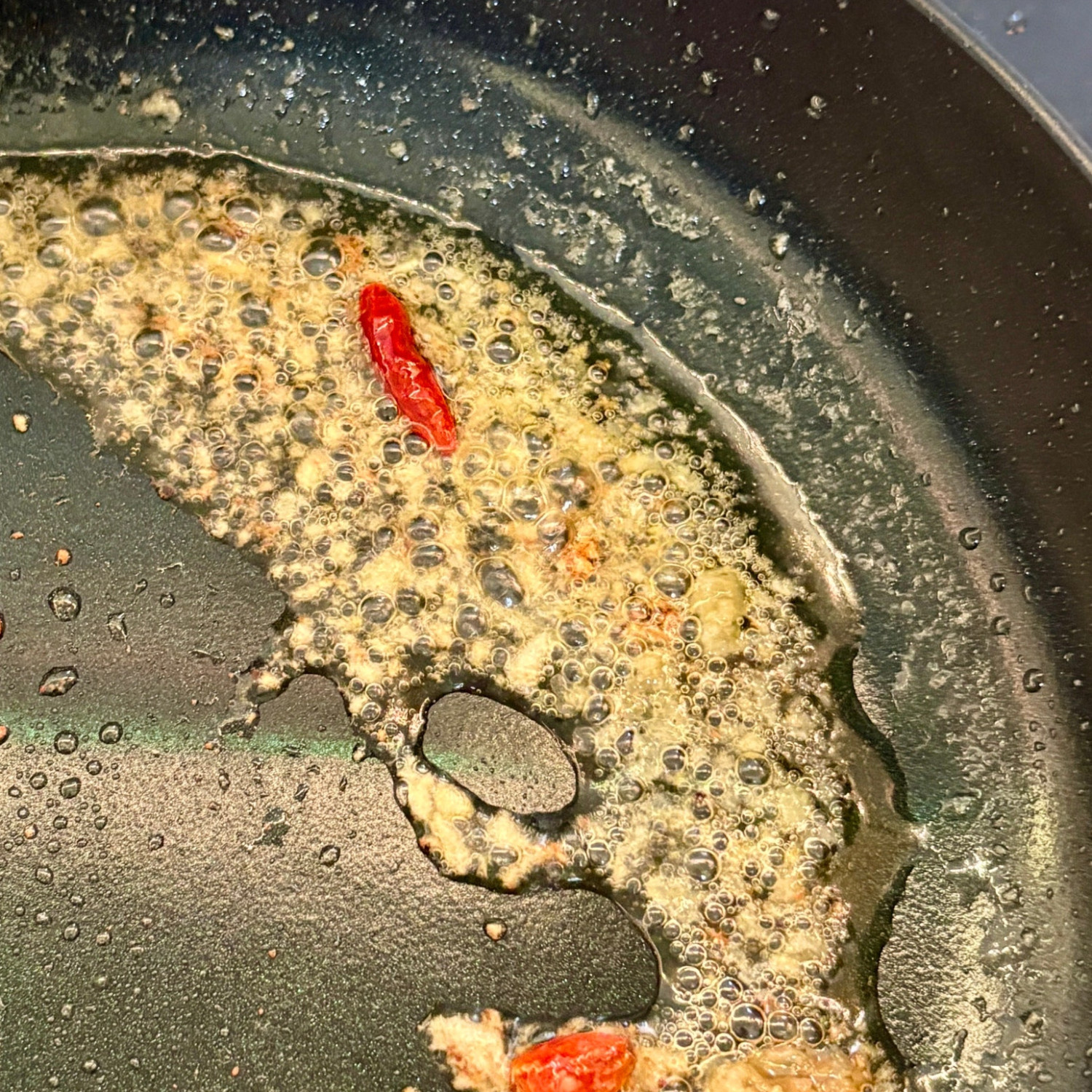 새우 구운 팬에 올리브오일 추가해서 다진 마늘과 페페론치노 볶기
