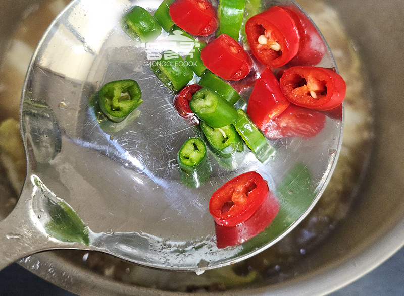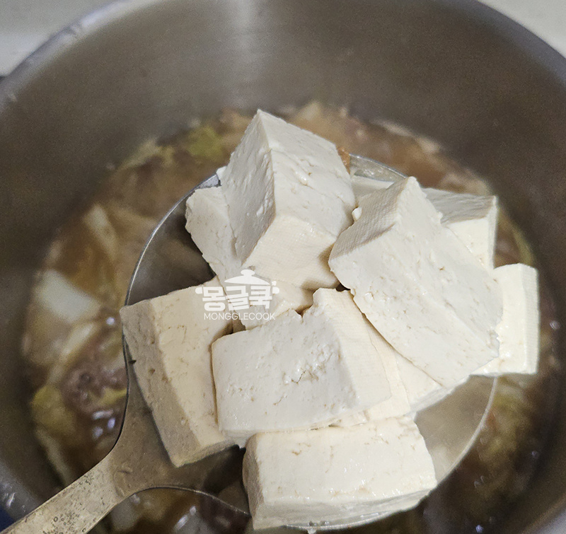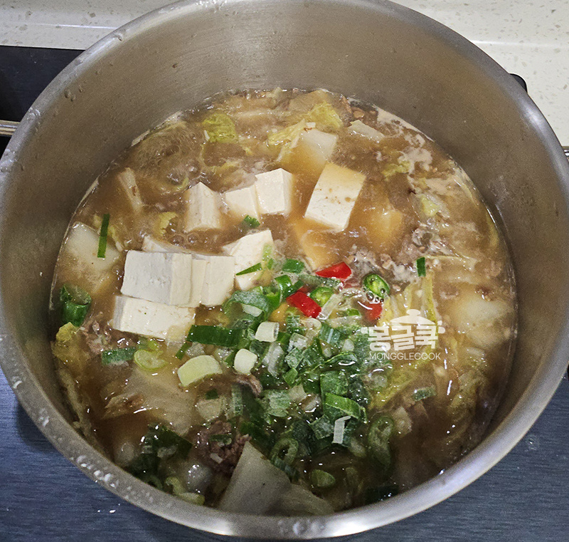 마지막으로 두부, 대파, 청양고추를 넣고 중약불에서 3분 정도 더 끓입니다.