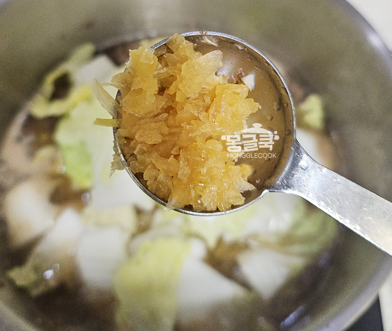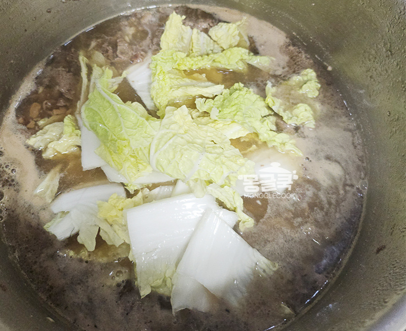 국물이 끓으면 썰어 둔 배추, 남은 다진 마늘 1/2 큰술 넣어주세요.