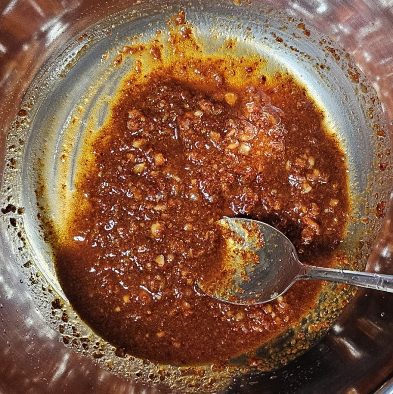 고춧가루 2T 간장 1T 식초 2T 설탕 1T 다진 마늘 1T 참기름 1T