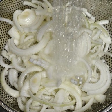 이 과정에서 매운 맛이 물에 빠져나가면서 양파는 더 아삭해집니다