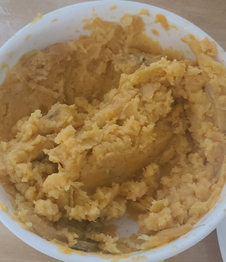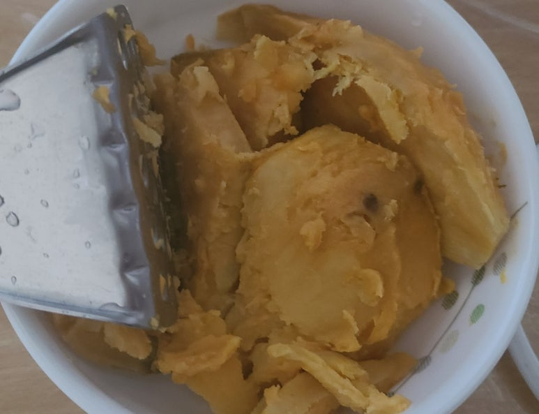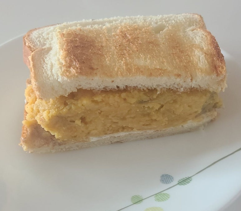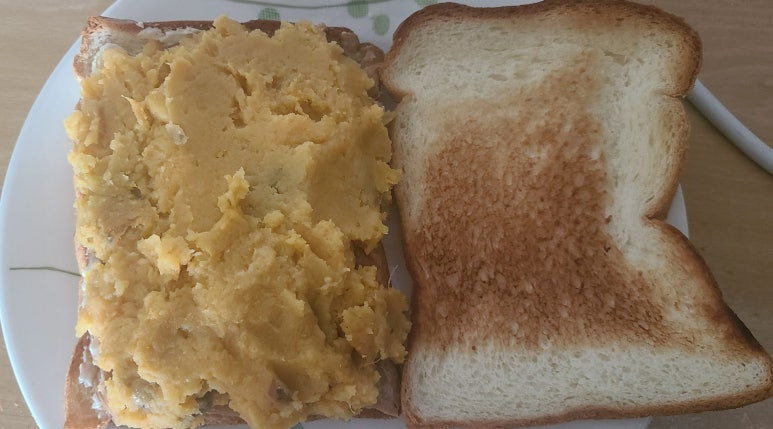 식빵 2쪽, 크림치즈 조금, 땅콩잼 조금, 찐 고구마.