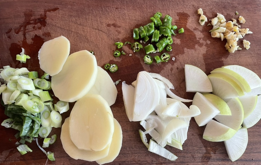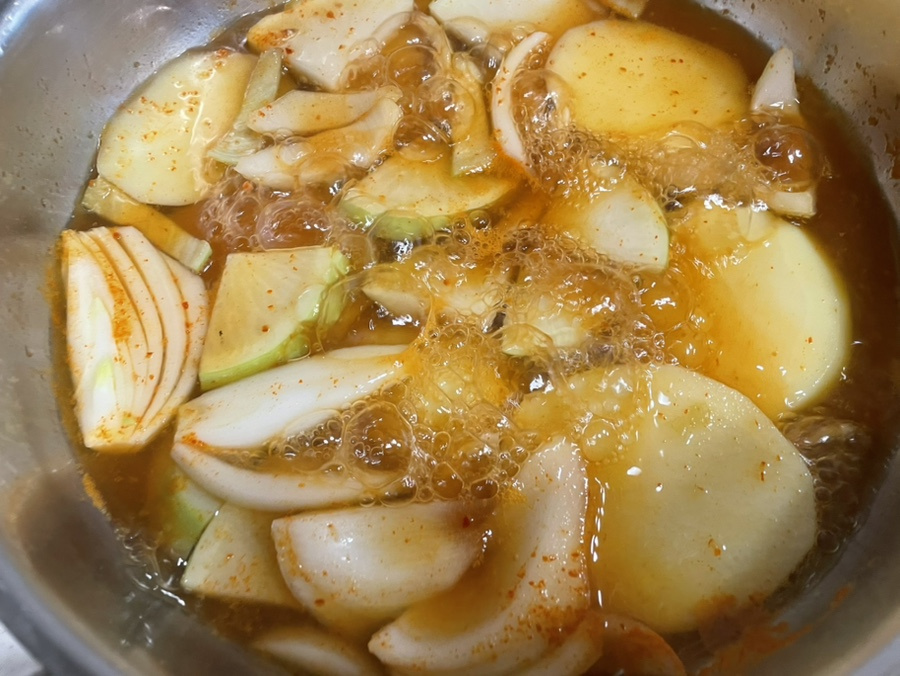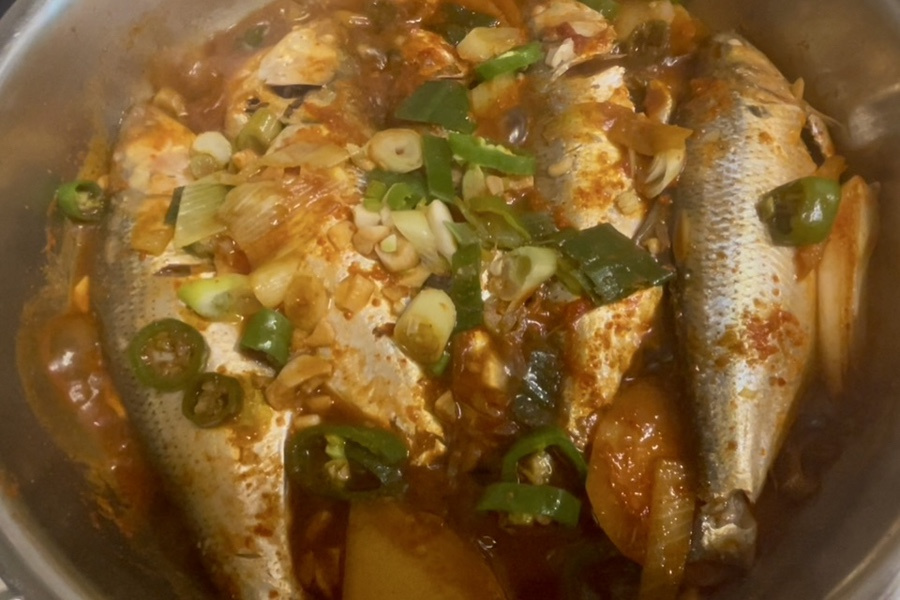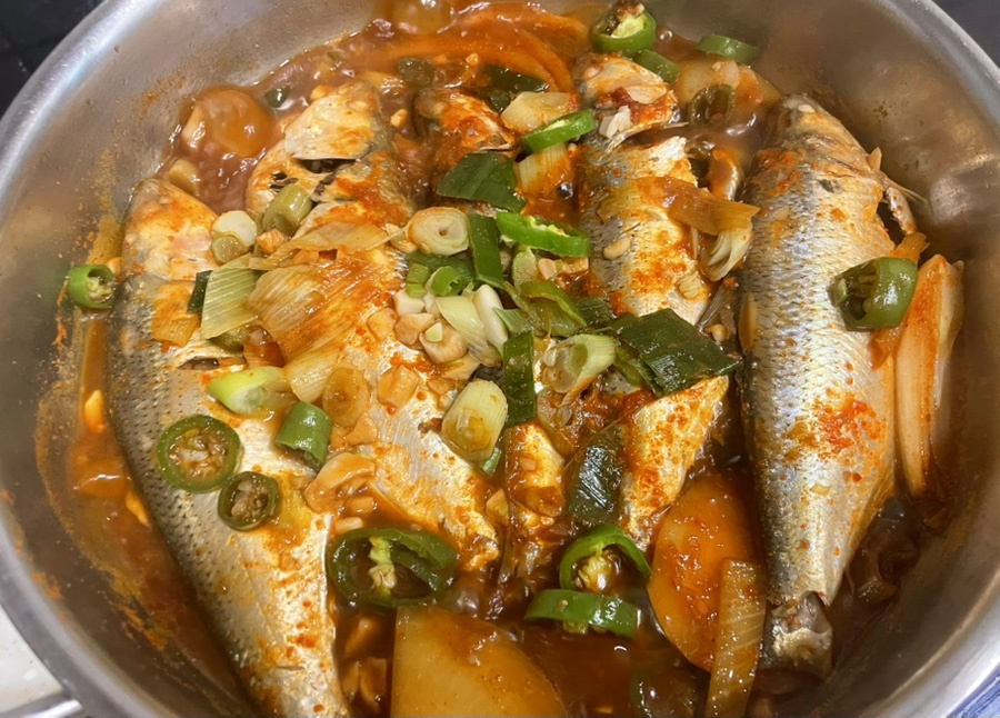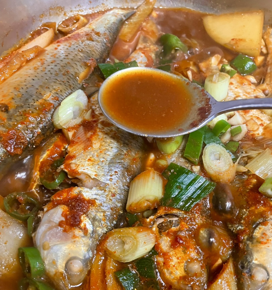 조림 양념이 생선과 야채 맛이 우러나서 매콤하면서도 풍미가 좋아서 같이 조린 무와 감자도 아주 맛있어요.