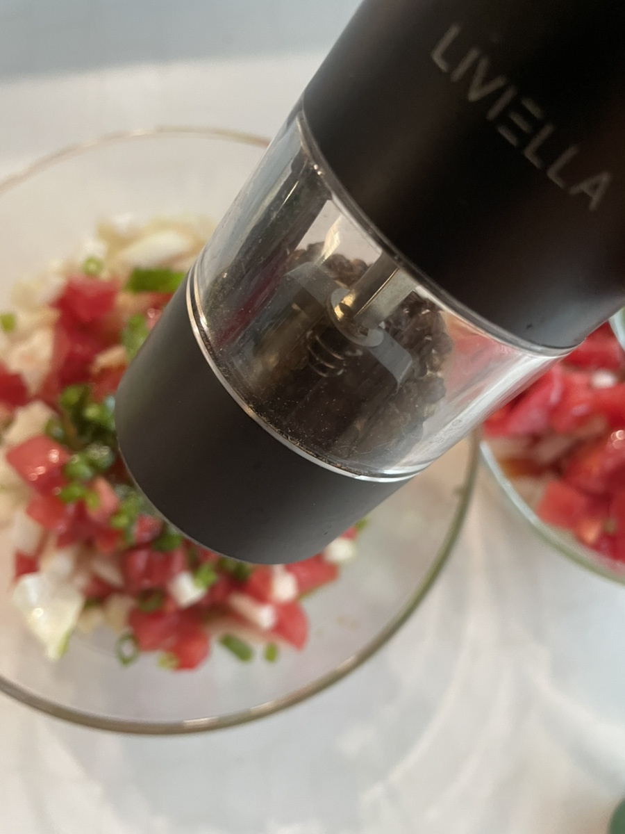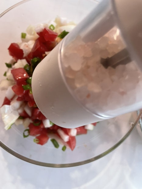 아보카도 2개 , 토마토 1개 , 양파 1/2개 , 빨간 파프리카 1/3개 , 노란 파프리카 1/3개 , 초록 쪽파잎이나 고수 약간 , 올리브오일 3큰술 , 레몬즙 3큰술 , 꿀 1큰술 , 소금 2꼬집 , 후추 약간