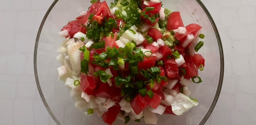 아보카도를 으깨고 파프리카와 토마토, 양파를 잘게 다져 넣고 올리브오일, 레몬즙, 꿀, 소금, 후추를 넣고 버무려 주면 신선함이 가득한 과카몰리소스가 되요.