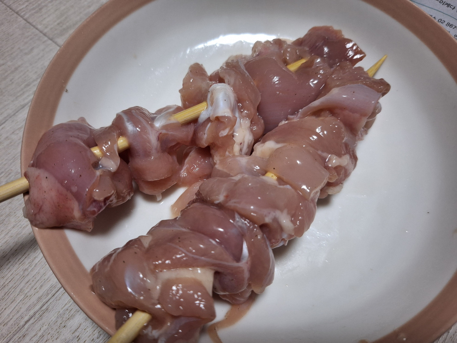 10분 후에 재워둔 닭고기를 꼬치에 끼워줍니다.