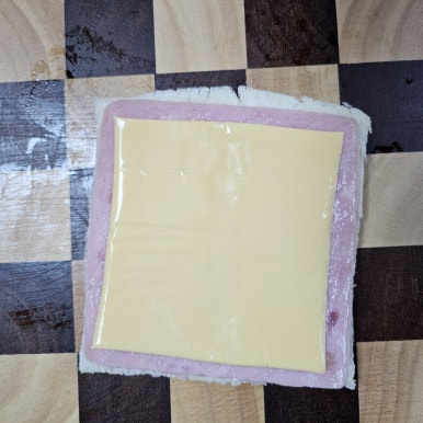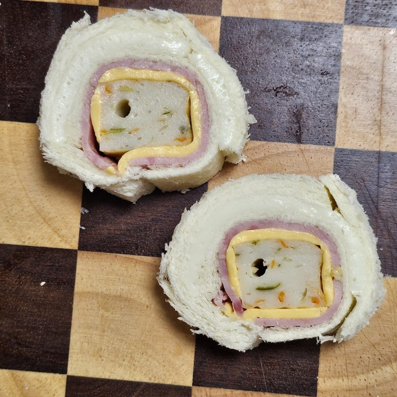 손질한 어묵, 식빵 3장, 모짜렐라 치즈 1장, 슬라이스 햄 1장, 체다치즈 1장