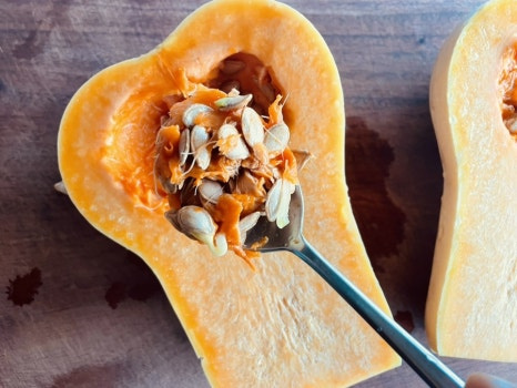 숟가락으로 호박의 씨 부분을 긁어 내요.