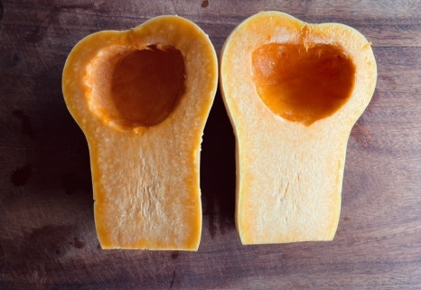땅콩호박을 한번 씻고 반을 갈라 주세요.