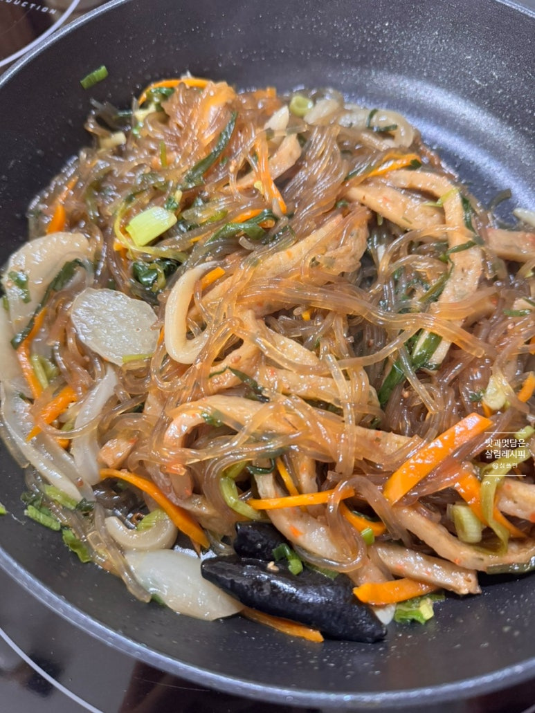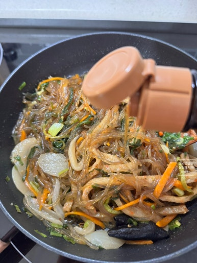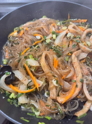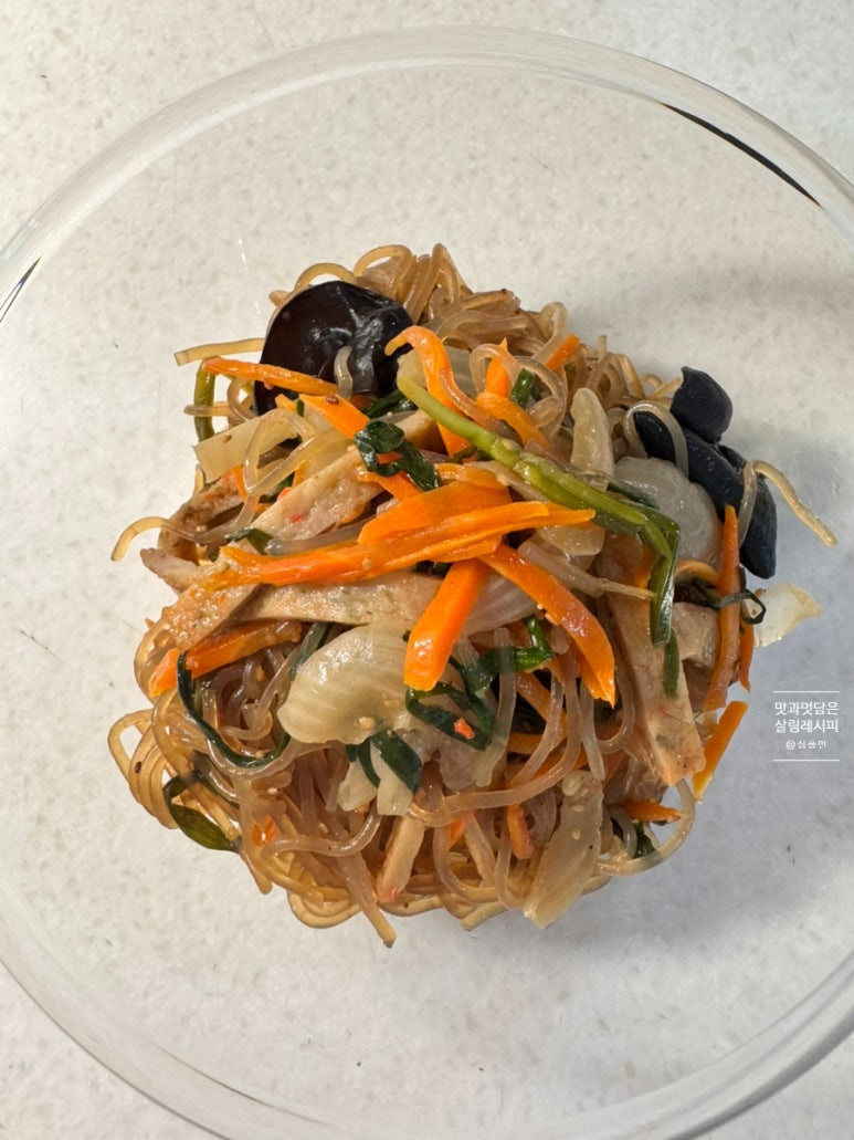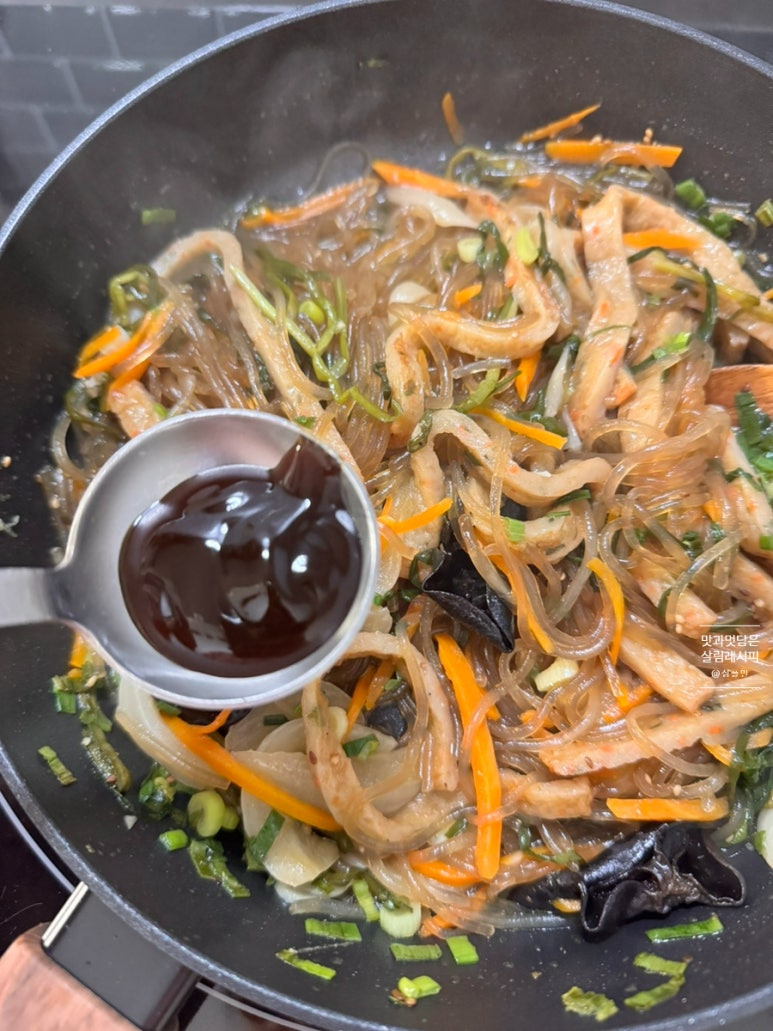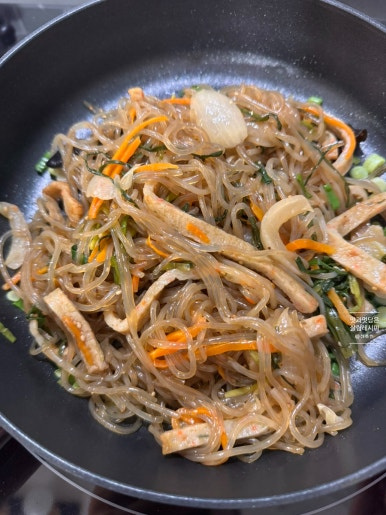 잡채 자체에 간이 충분히 되어있으면서 야채를 비롯한 각종 재료가 푸짐하게 들어있기 때문에 추가 재료 없이도 굴소스 하나만으로도 충분히 맛있게 만들 수 있어요.