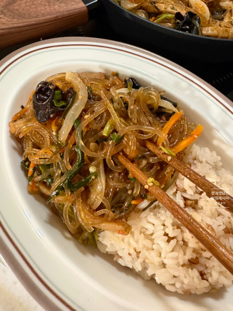부드럽고 촉촉하게 만든 쫄깃한 잡.채.덮.밥입니다. 불지 않은 당면으로 그냥 먹어도 좋은데요. 꼬들꼬들 뜨끈하게 볶아 밥과 함께 얹어내 별미 메뉴 뚝딱 완성되었네요.