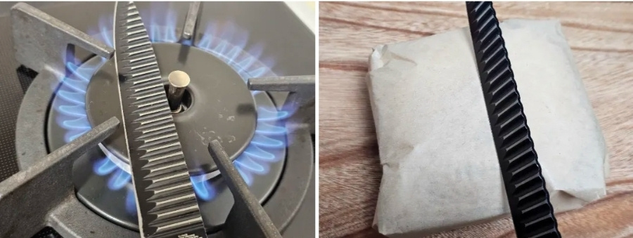 가스불이 없을 때에는 칼을 뜨거운 물에 담갔다가 썰면 깔끔한 절단면이 된답니다.