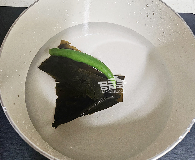 냄비에는 물 750ml를 붓고, 다시마와 청양고추를 넣어 센 불에서 끓여주세요.