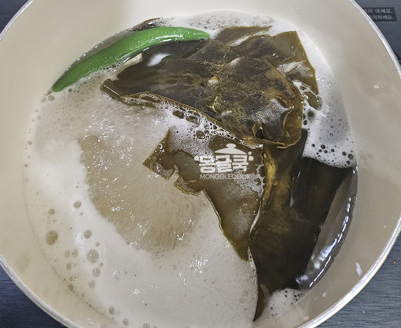 충분히 우러나면 다시마와 고추를 건져내고 육수만 남겨두세요.