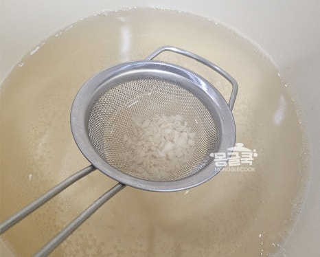 이때 다진 마늘을 채망에 넣어 1~2분 정도만 우려내고 바로 건져내면 국물 맛은 깔끔하면서 은은한 마늘향만 남아 좋아요
