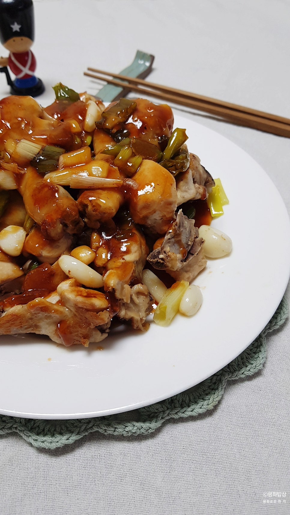 닭볶음용 한 팩 , 소금 3 꼬집 , 통마늘 10 알 정도 , 고추 적당히 , 대파 1 대 굵게 , 생강 1 톨 편으로 , 대파 1/2 작게 , 식용유 2 큰 술 < 소스 > 설탕 1 큰 술 , 간장 2 큰 술 , 물엿 6 큰 술 , 식초 1 큰 술 , 케찹 1 큰 술 , 전분 1 숟가락 , 물 1 숟가락