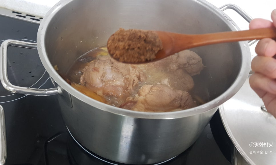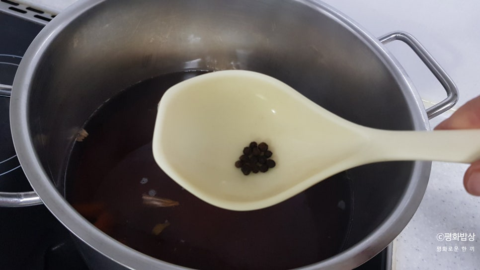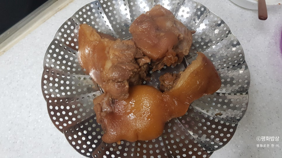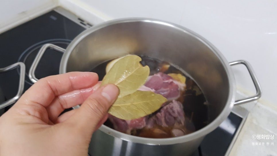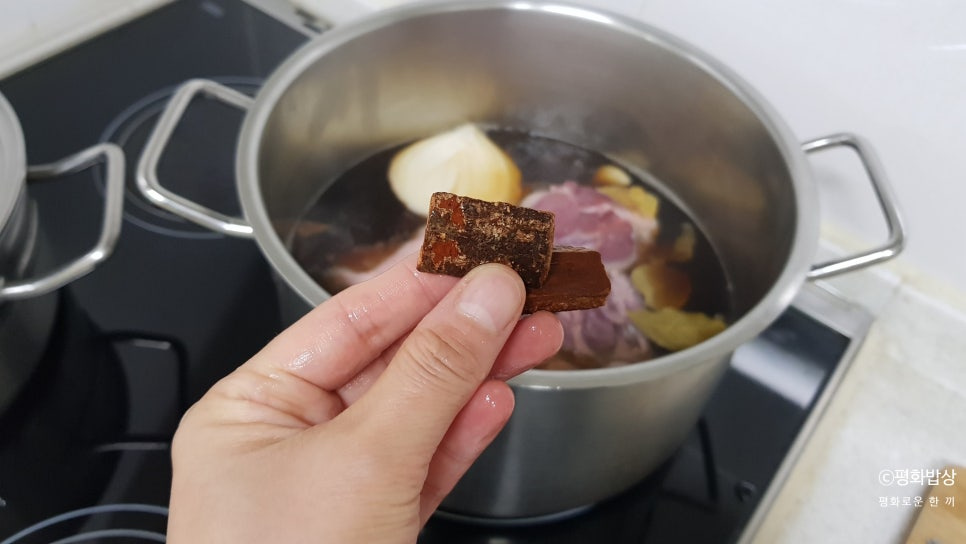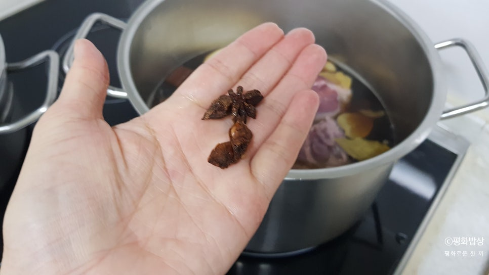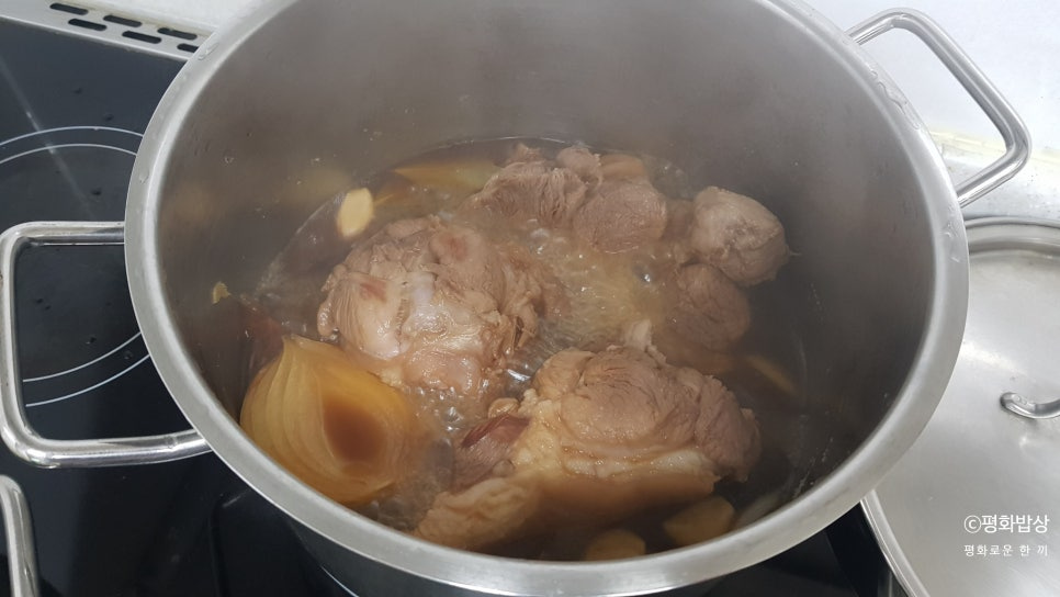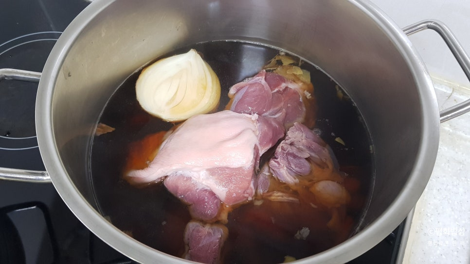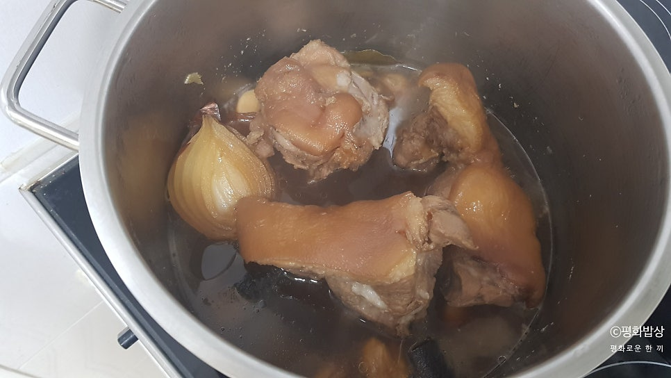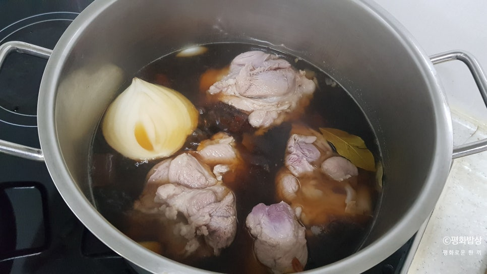 앞다리살 사태 870 g 정도 , 진간장 70 ml , 설탕 70 ml , 참치액 20 ml , 흑설탕 1 큰 술 물 2 L 굵은소금 1 큰 술 , 식초 20 ml , 양파 껍질 째 1/2 개 , 생강 1 톨 정도 , 통마늘 6알 정도 통후추 10 알 정도 (생강과 마늘의 양을 비슷하게 맞췄다. ), 팔각 2 개 , 계피 2 조각 , 월계수 잎 2 장