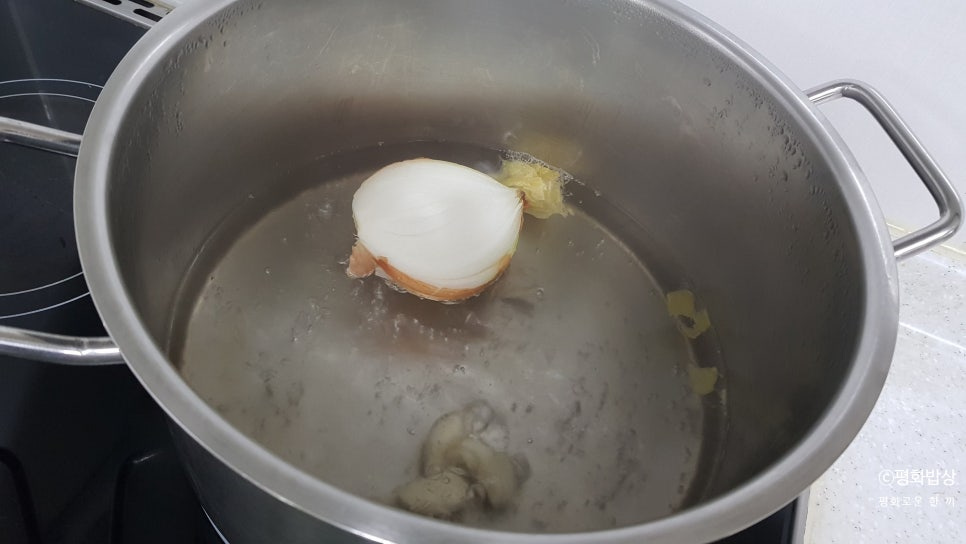 껍질있는 양파, 생강, 통마늘을 넣어준다.