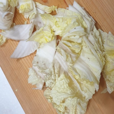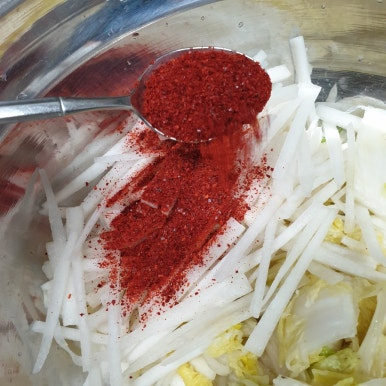 채 썬 무와 배추를 넣어주고