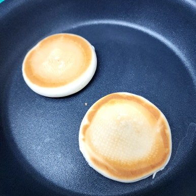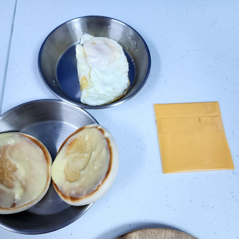 구운 호떡 2장, 계란후라이 1개, 치즈 1장, 소스