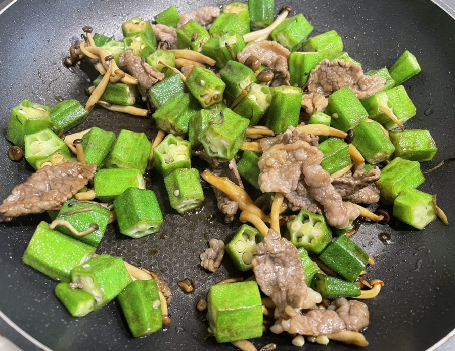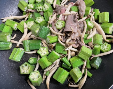 차돌박이도 얇고 오크라와 버섯도 오래 조릴 필요가 없어서 부드럽게 익을 정도만 되면 되서 차돌박이랑 오크라와 만가닥 버섯을 같이 넣고 볶아 주세요.