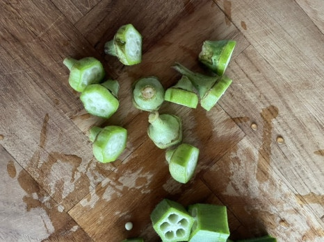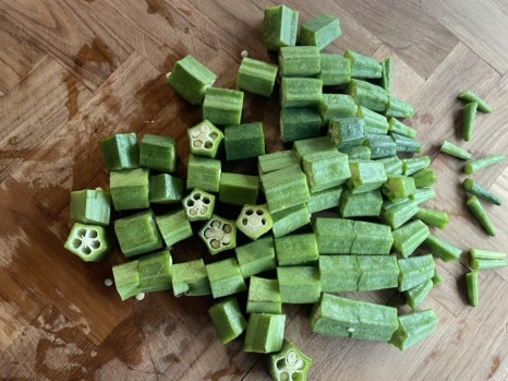 오크라는 꼭지와 끝부분을 잘라 내고1cm 정도 크기로 썰어 주세요.