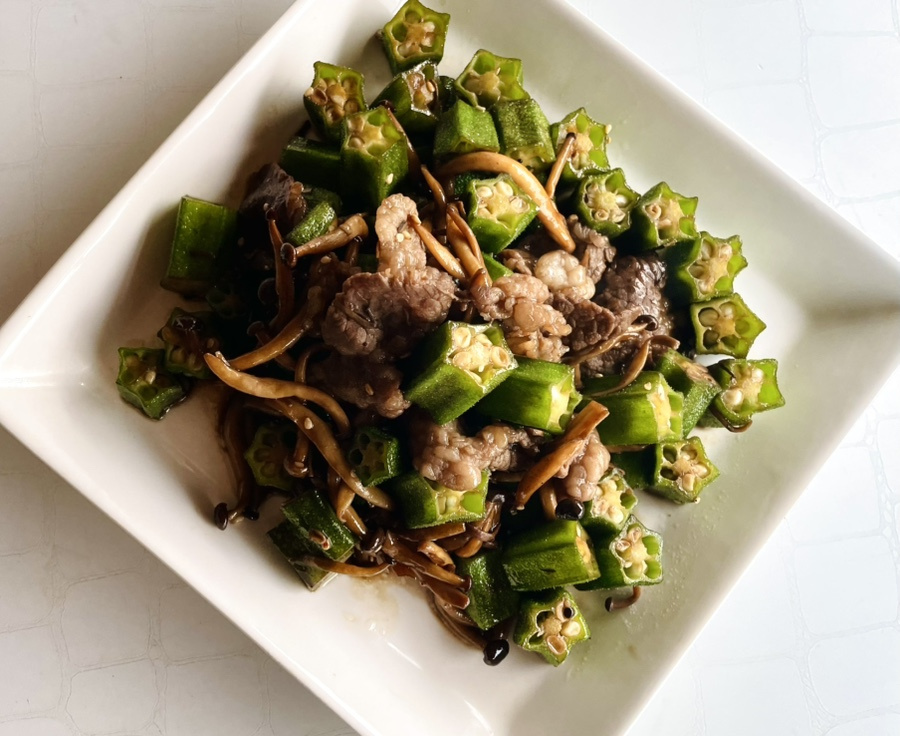 단짠의 양념에 조려진 부드럽고 쫄깃한 오크라와 쫄깃하고 고소한 차돌박이 덮밥 완성이예요.