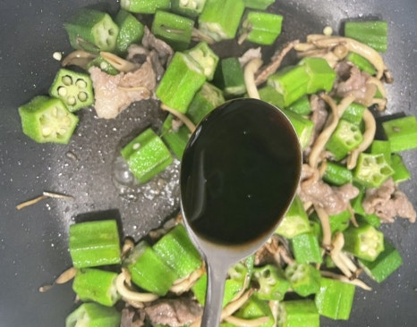 오크라가 초록색이 짙어지고 차돌이 핏기가 없어지면 스끼야끼 간장 2큰술