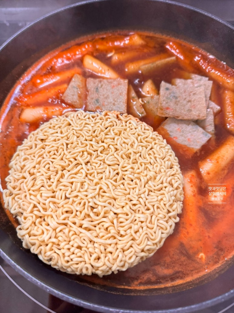 아이들 기호에 맞춰 쫄깃한 쌀떡으로 만들었지만 말랑한 밀떡을 넣어주어도 맛있어요. 라면사리 1개 충분히 넣어 라볶이와 같이 즐길 수도 있는 레시피에요.