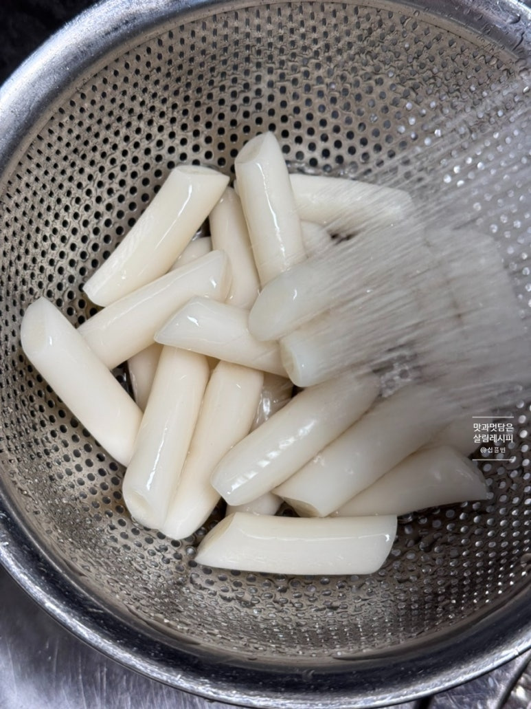떡은 기호에 맞게 쌀떡 또는 밀떡으로 준비하면 되고요. 저희는 아이들이 좋아하는 쌀떡으로 준비했어요. 물에 가볍게 헹구어 줍니다.