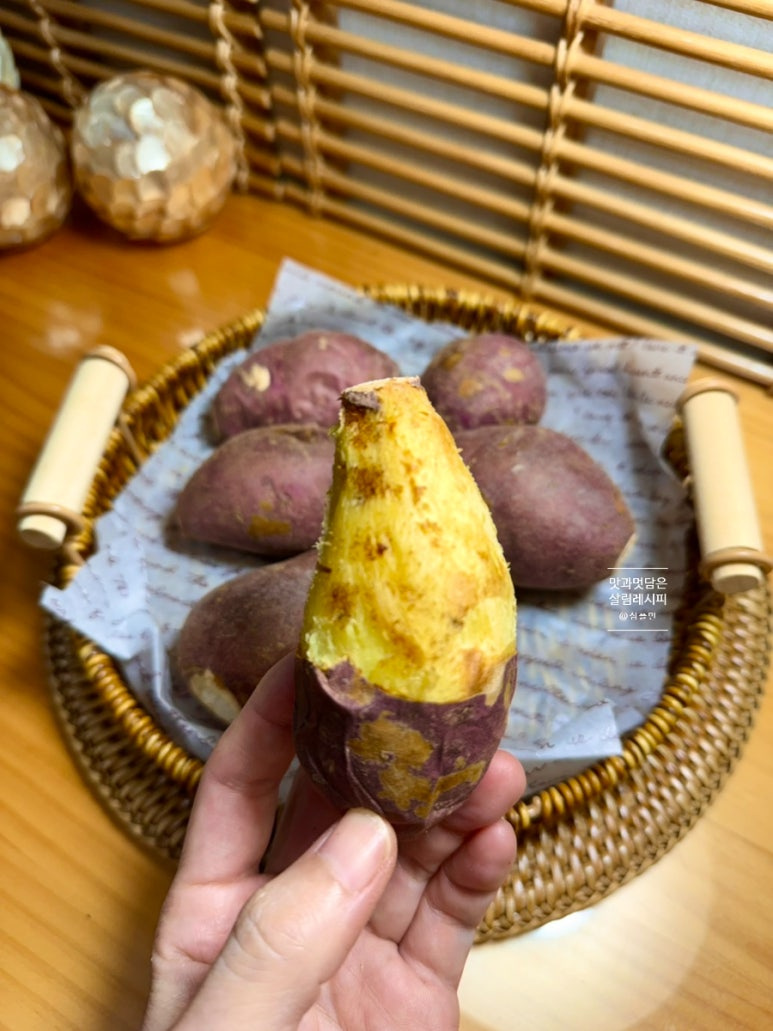 껍질이 쏙쏙 너무 잘 까지고 겉은 바삭 속살은 촉촉하게 구워져서 일명 겉바속촉으로 정말 맛있게 만들어졌어요. 손쉽기 때문에 겨울 내내 고구마 간식으로 즐겨 만들곤 하는데요. 찜이나 삶는 레시피보다 간단하면서 맛이 좋기 때문에 적극 추천드리는 방법이에요.