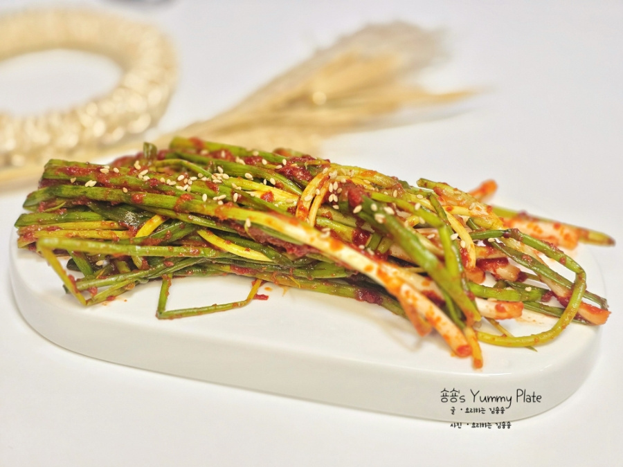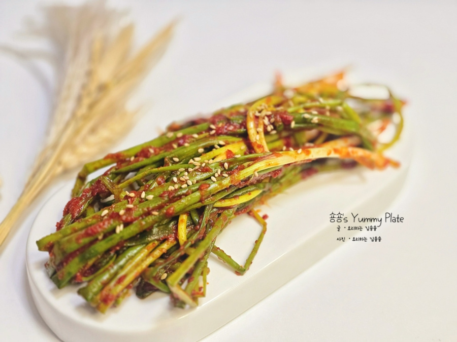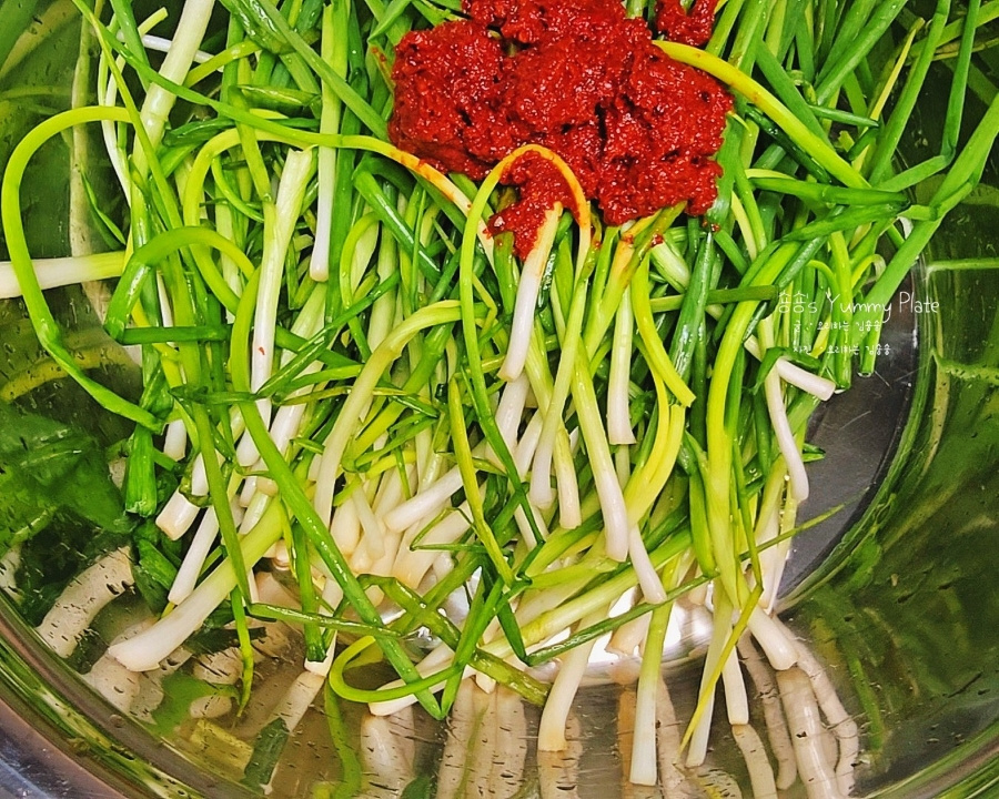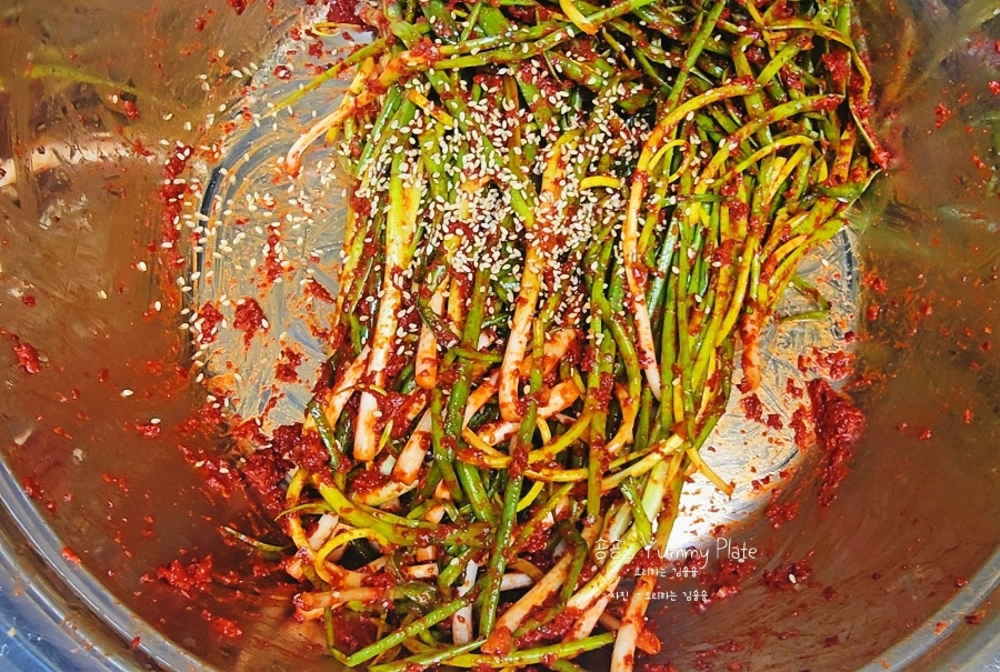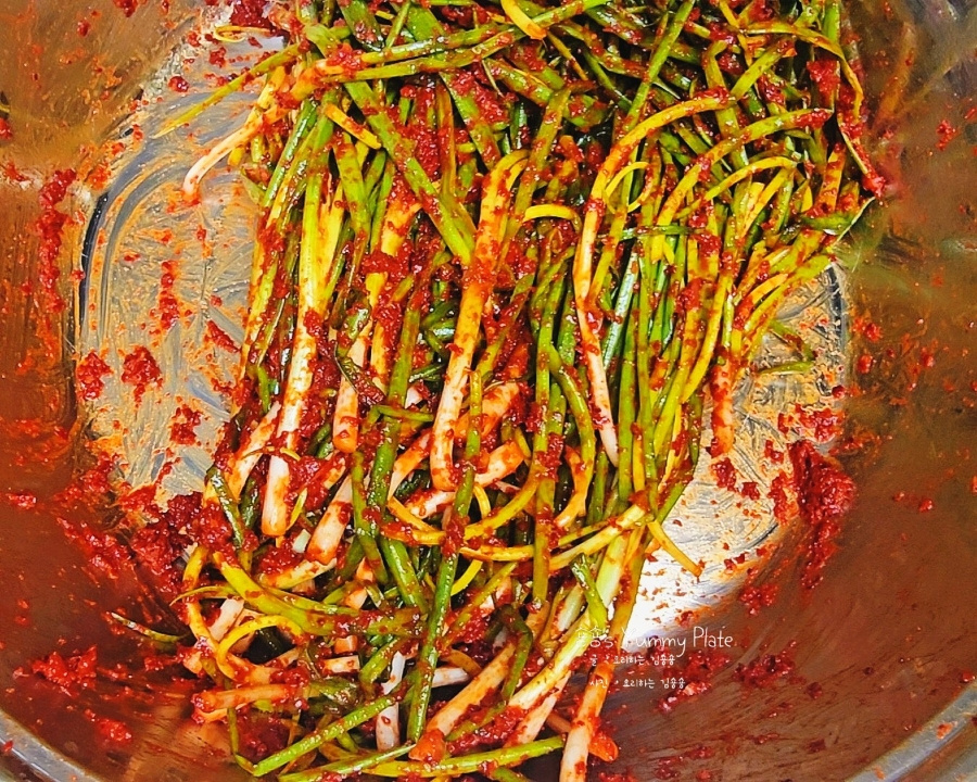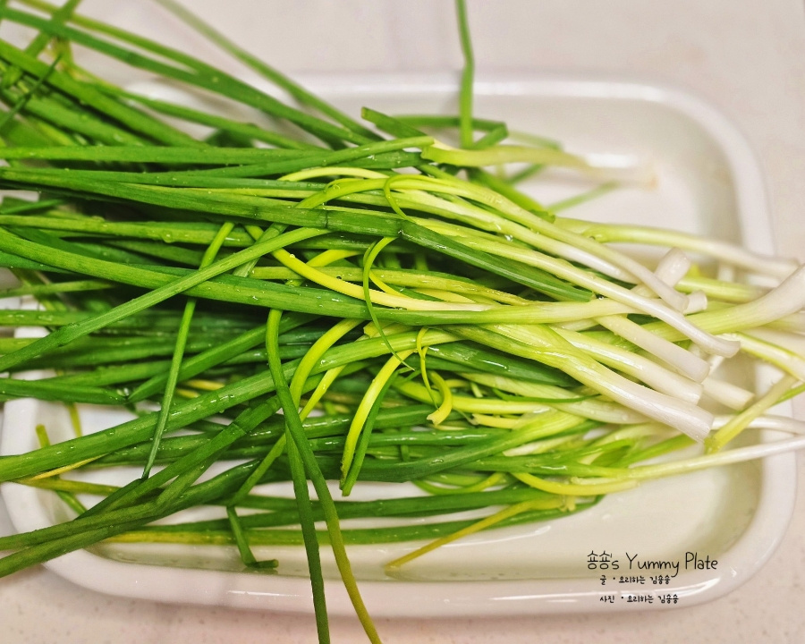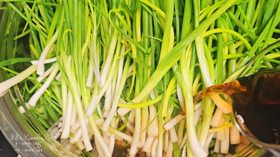쪽파의 흰 끝부분에 양념이 잘 스며들도록 꼼꼼하게 발라주어야 끝부분의 매운맛을 잡아줘요.