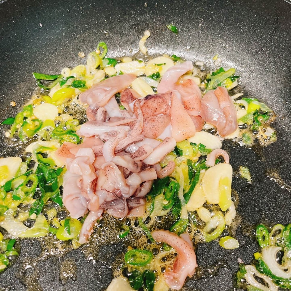 오징어는 칼집내서 적당한크기로 썰어서 준비해주세요