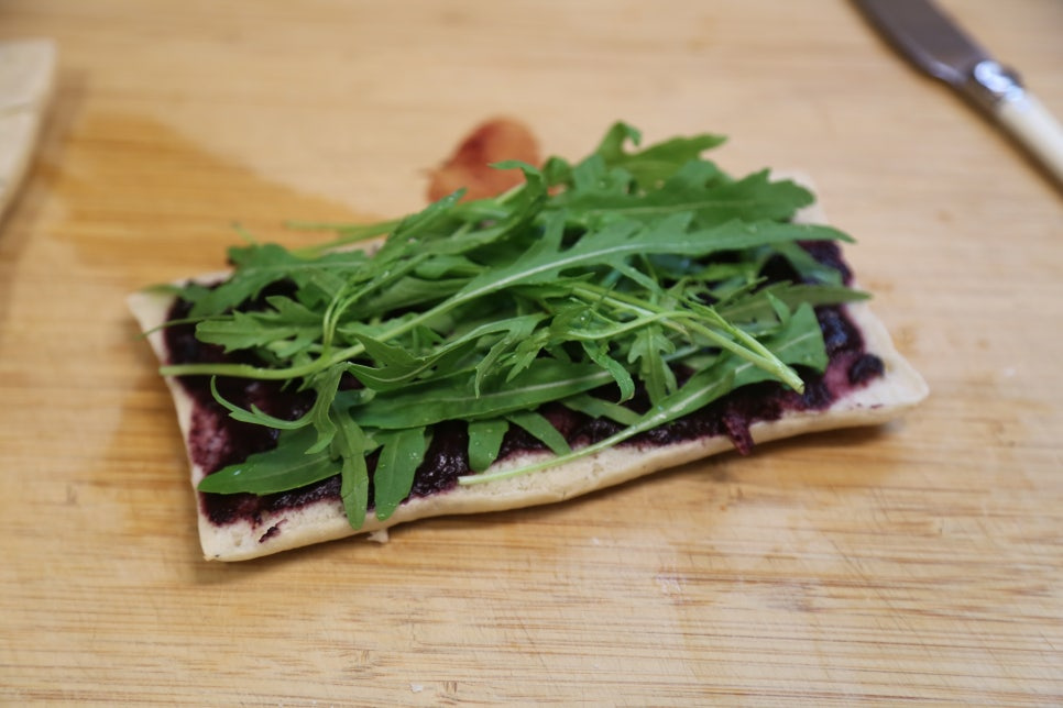 치아바타 1/2개, 블루베리퓨레 3스푼, 루꼴라 한줌