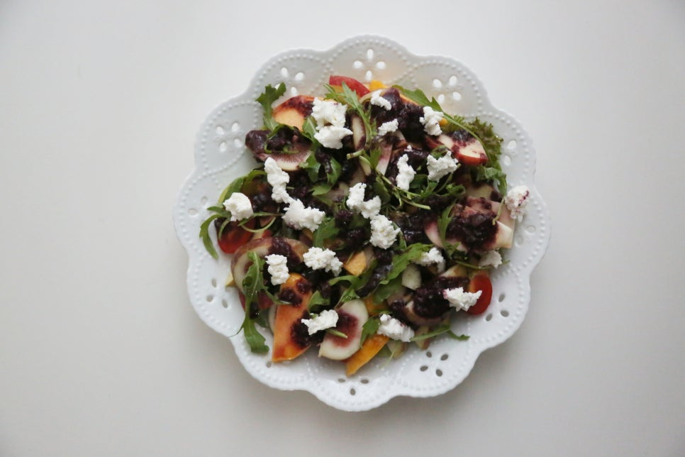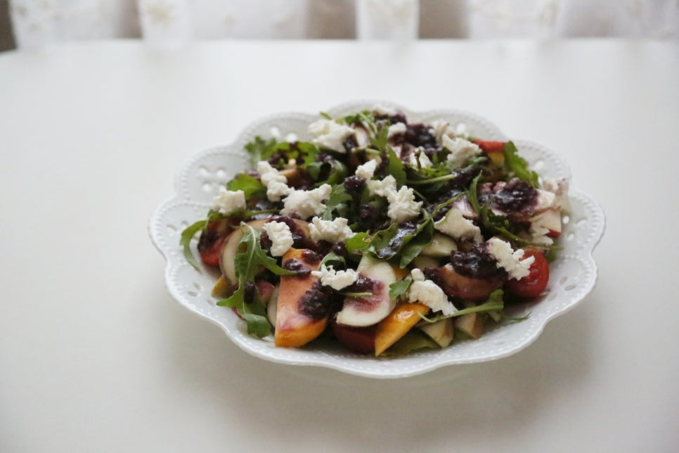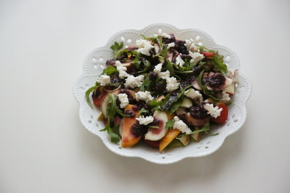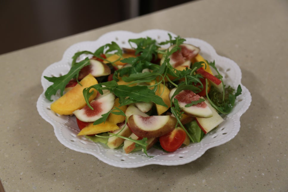 쌈채소 한줌, 사과 1/2개, 복숭아 1/2개, 방울토마토 3개, 무화과 1개, 루꼴라 한줌