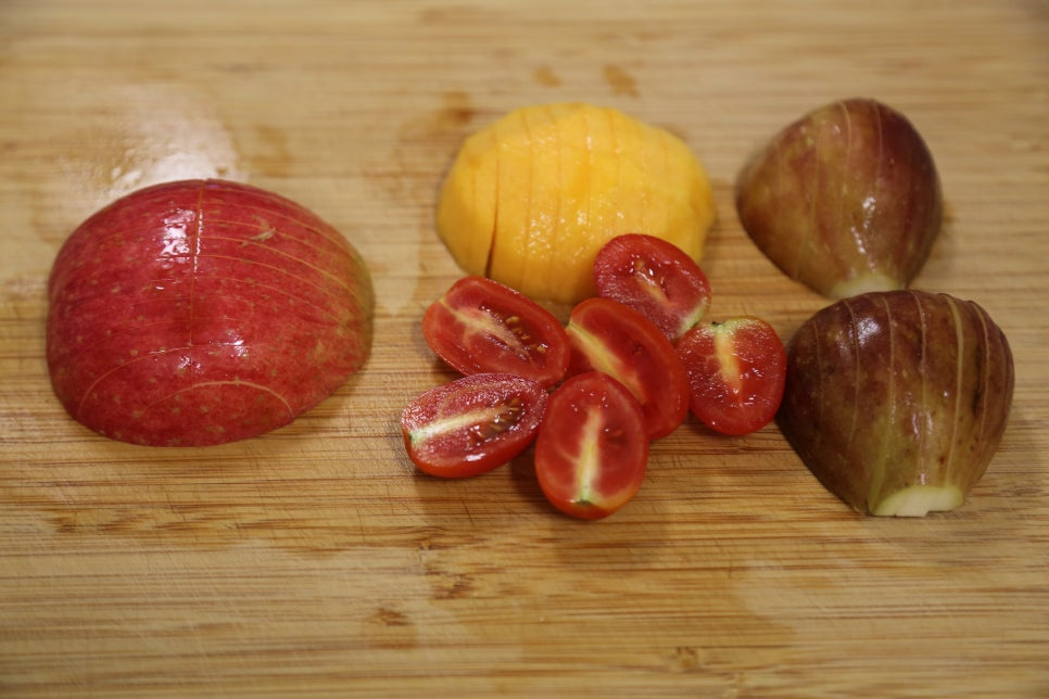 사과 1/2개, 무화과 1개, 방울토마토 3개, 복숭아 1/2개