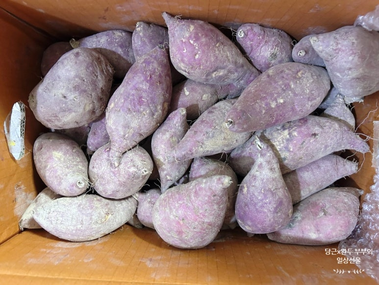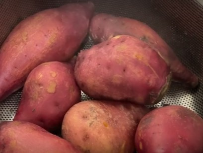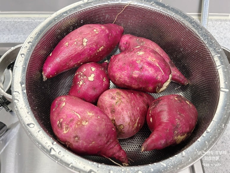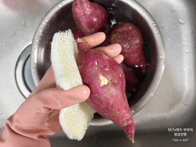 고구마 표면에 흙이 많이 붙어 있으면 물에 담가서 흙과 이물질이 떨어질 수 있게 해주세요.
